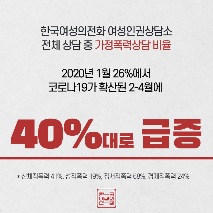9. Çѱ¹¿©¼ºÀÇÀüÈ ¿©¼ºÀαǻó´ã¼Ò Àüü »ó´ã Áß °¡Á¤Æø·Â»ó´ã ºñÀ² 2020³â 1¿ù 26%¿¡¼ Äڷγª19°¡ È®»êµÈ 2-4¿ù¿¡ 40%´ë·Î ±ÞÁõ (½ÅüÀûÆø·Â 41%, ¼ºÀûÆø·Â 19%, Á¤¼ÀûÆø·Â 68%, °æÁ¦ÀûÆø·Â 24%)